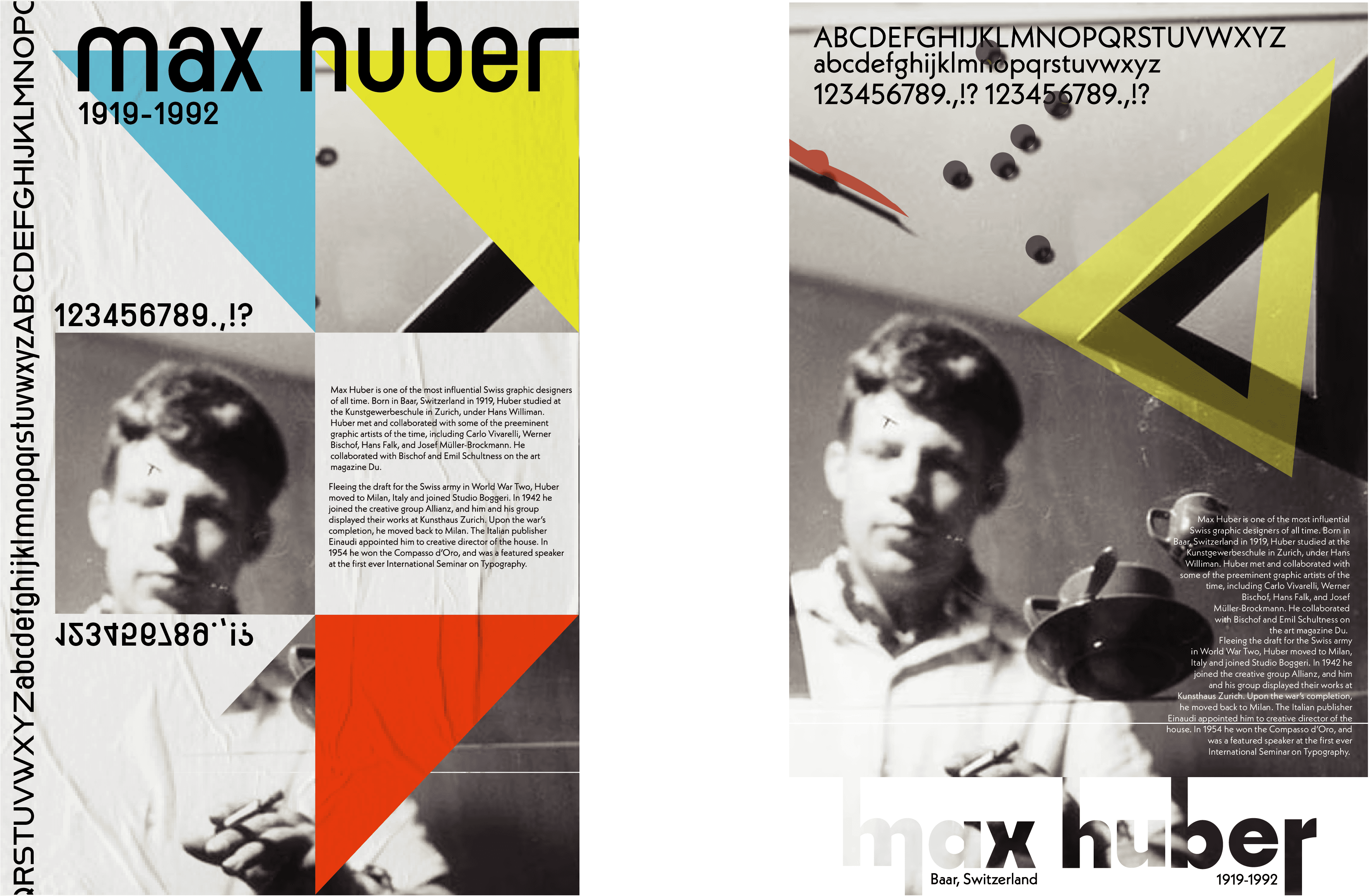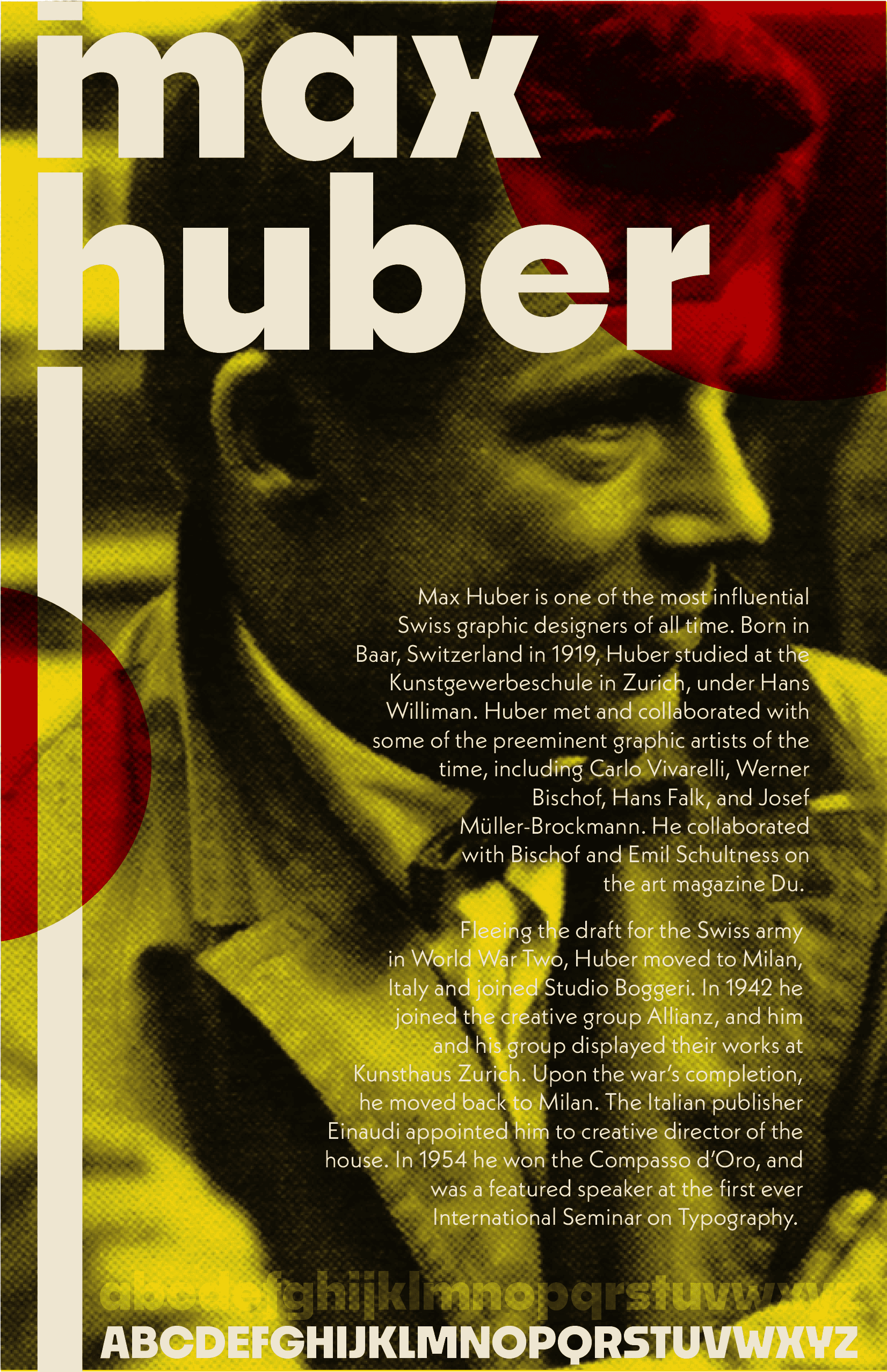 once again a class project, these posters depict max huber in his own style. the swiss style he was know for was something that i tried to make prevalent within the work. as always, i love the challenge :)